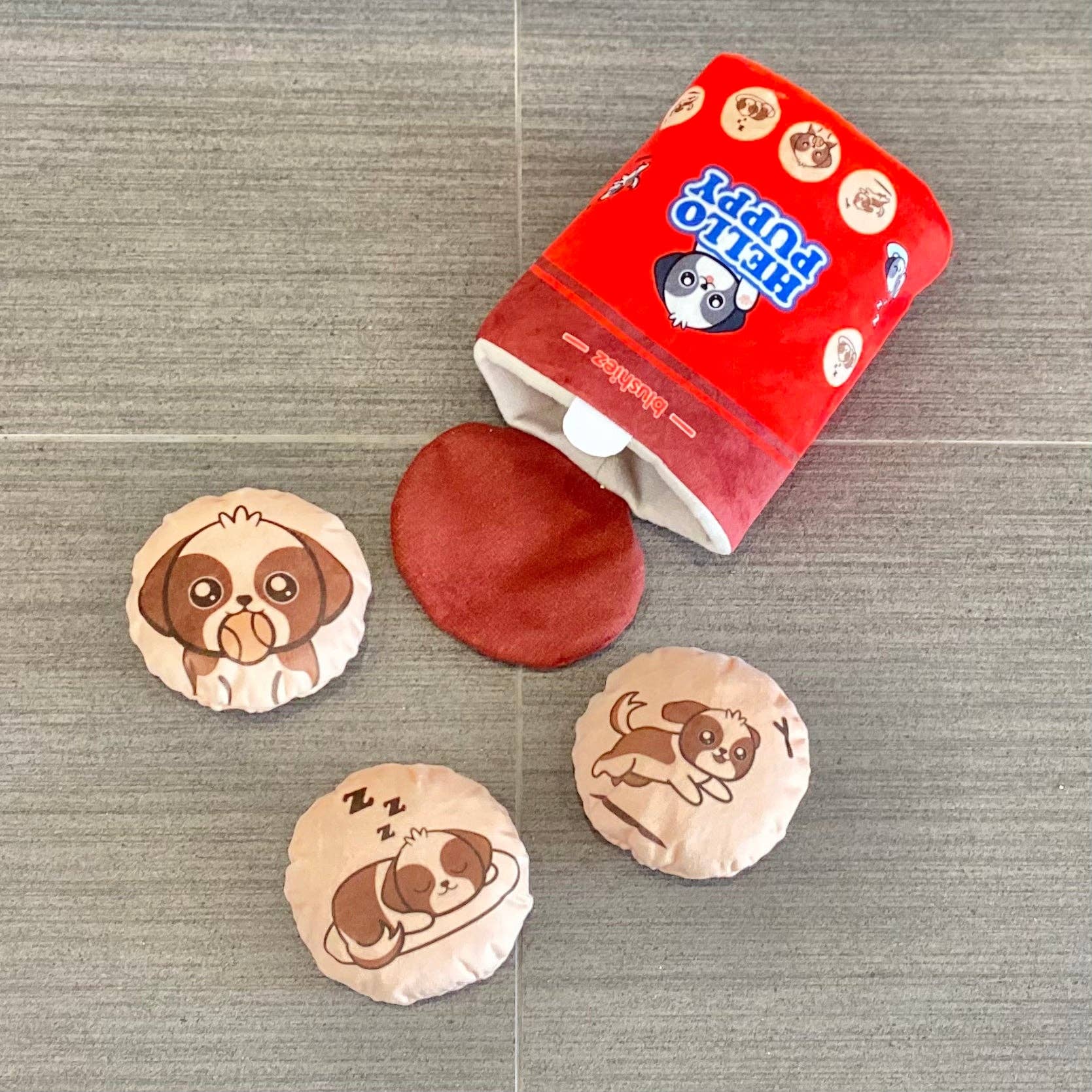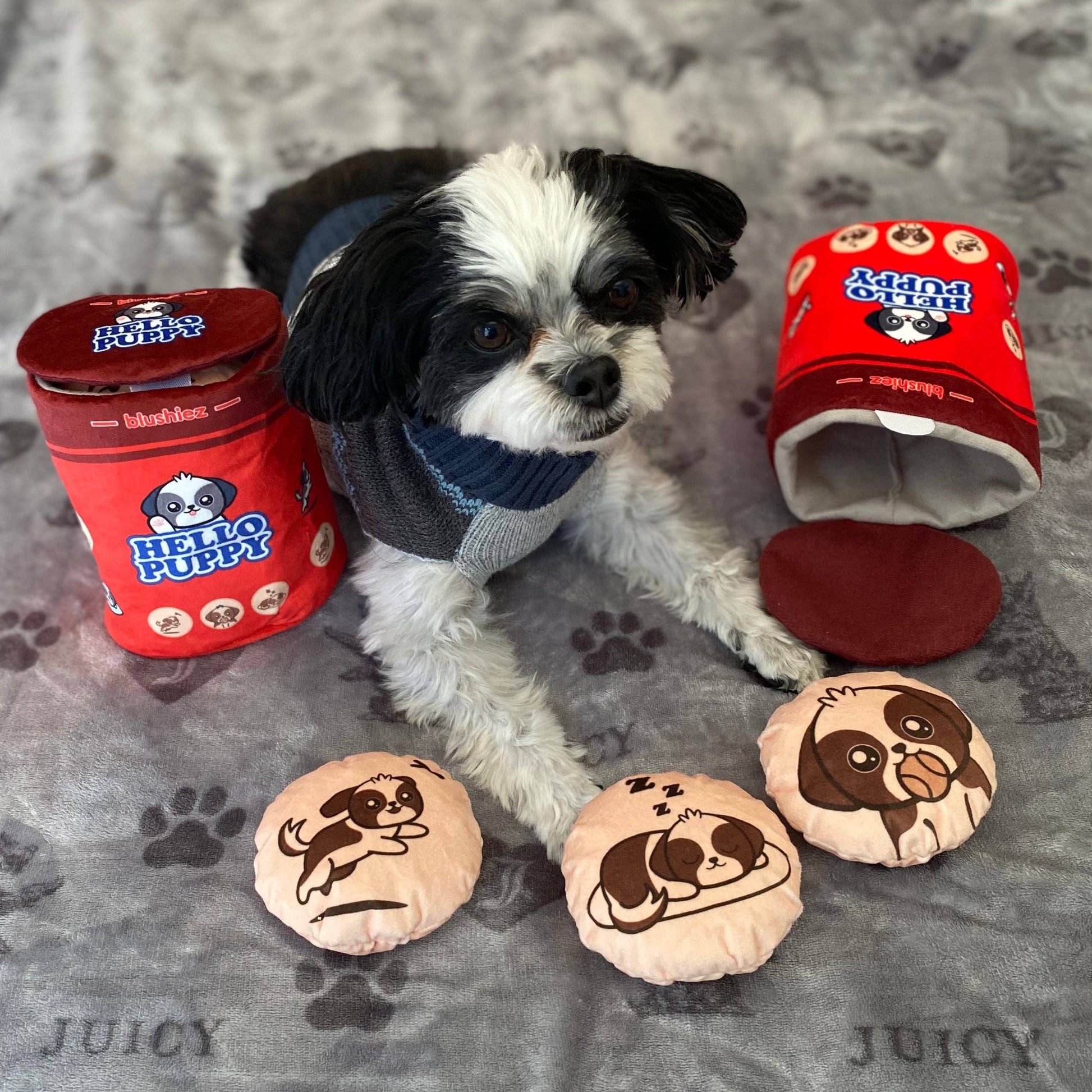 Your sweet fur babies deserve a sweet treat too! Pups and pawrents are obsessed with this super cute Hello Puppy 4-piece dog toy. Inspired by Blushiez 10 year old family Shihtzu, Charlie (featured in pics). Made out of a soft velvet-like material, the box has a Velcro closure which holds three “biscuits” and you can also hide any treats in there too for extra fun. The “biscuits” crinkle, squeak and are great for playing fetch!