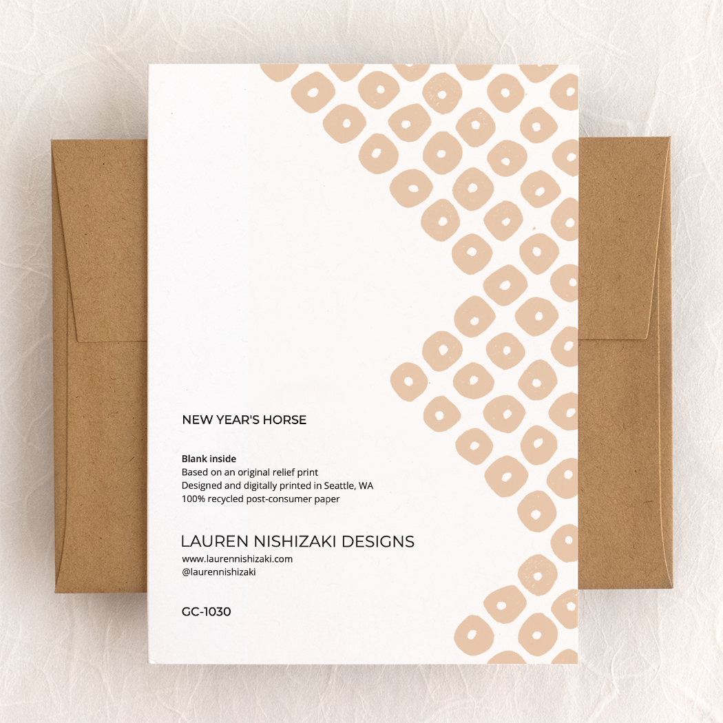 Based on an original linocut blockprint of a horse and kagami mochi, and designed to celebrate Japanese New Years and 2026, the Year of the Horse.