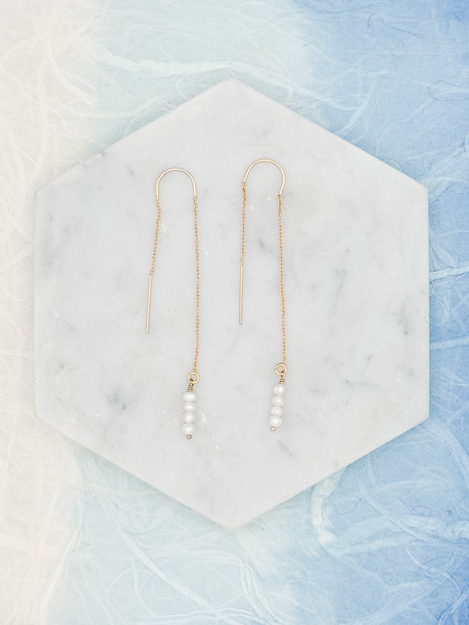 These classic pearl bar threaders are an elegant accessory for any outfit. The threader earrings are so light and easy to wear. Threaders have a "U" where they hang on your ears for added security. Sterling Silver or 14k Gold Fill.