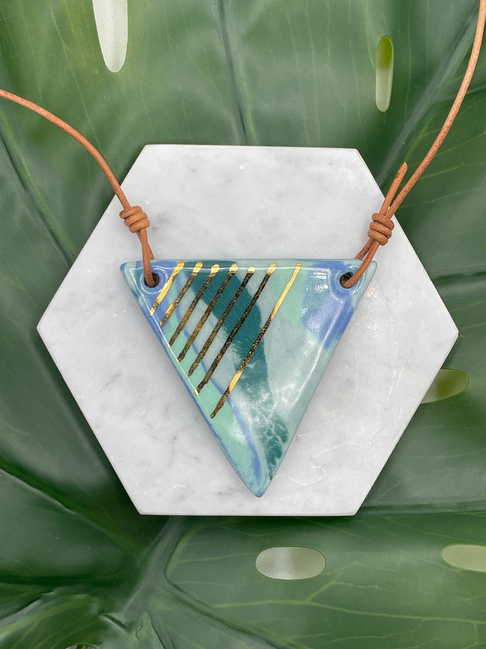 Glazed porcelain with accents of painted gold + greek leather cord. The front is glossy while the back has a smooth texture. Length of necklace is: 39cm (15.5"). Pendant is approximately 2.5cm x 5cm (2" x 1")